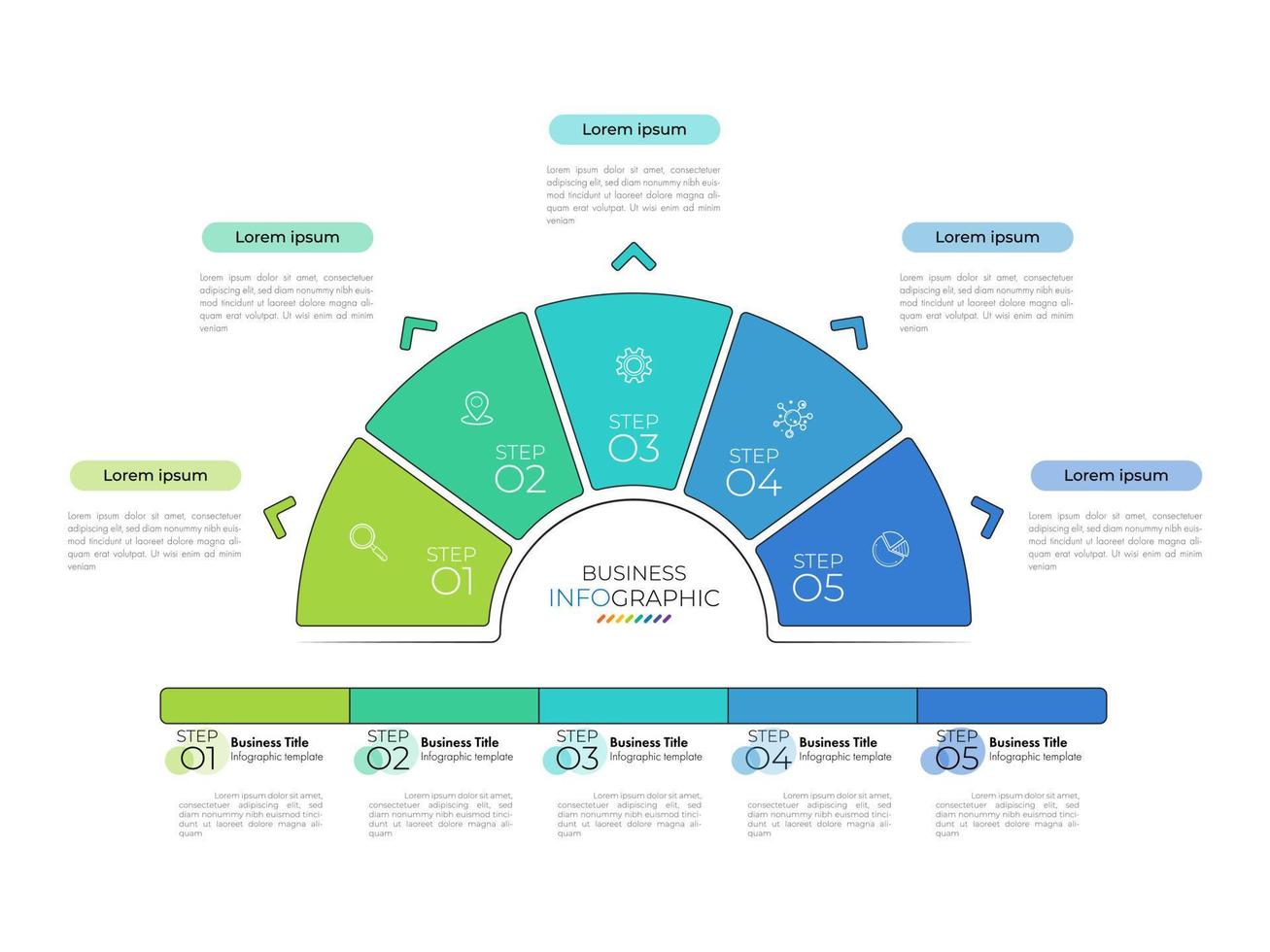 Business process chart infographics with 5 step, timeline infograph elements. Company presentation slide template. Modern vector info graphic layout design. Pro Vector