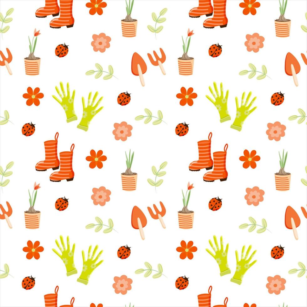 Seamless pattern of spring elements. Homework in the garden. Rubber boots, flowers, ladybugs and tools. Spring. Summer. Spring weather. Flat style vector. Suitable for textiles Pro Vector