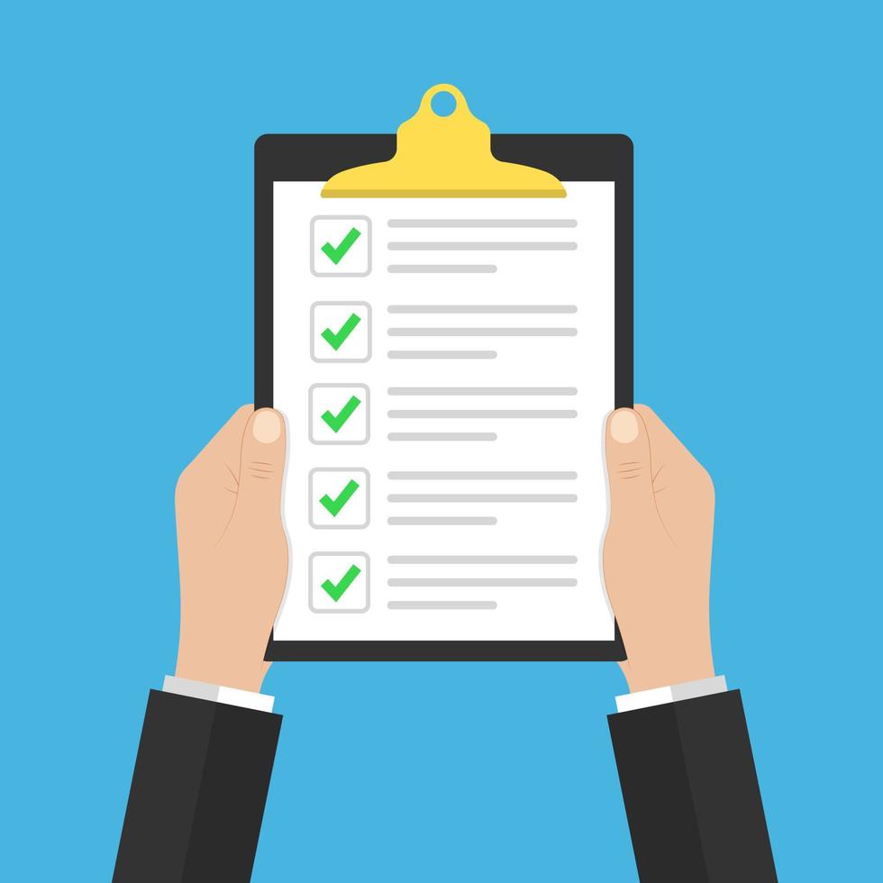 in hand checklist or document with green checkmarks. Application form, completed tasks, to-do list, survey concepts. Pro Vector
