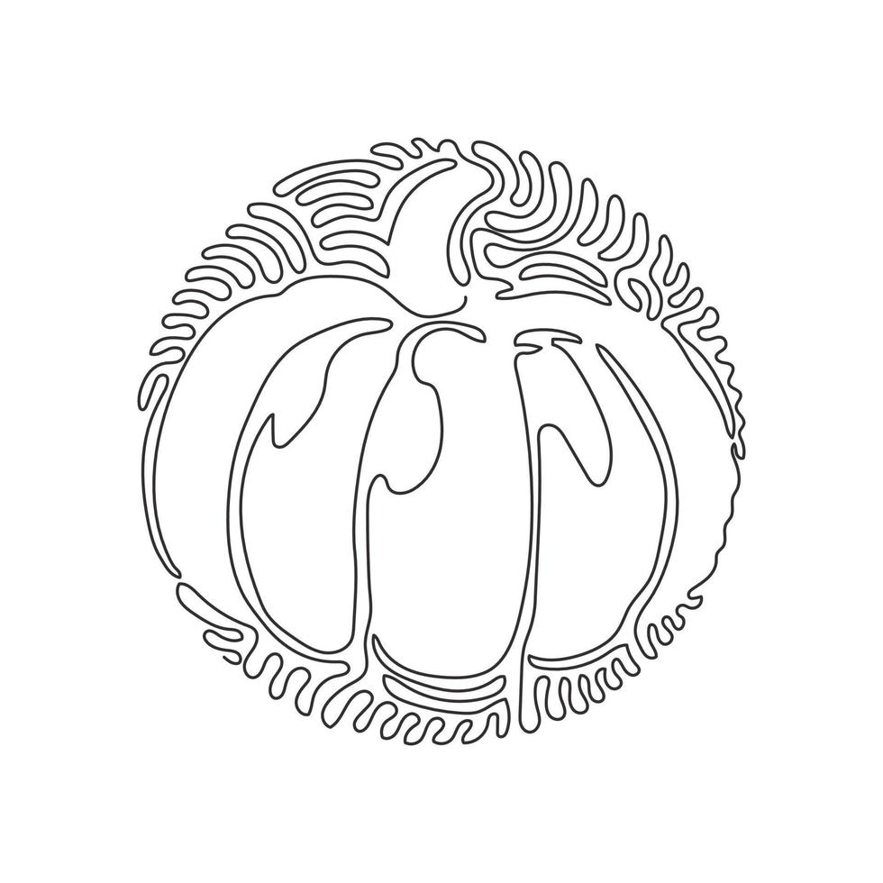 Single continuous line drawing healthy vegetables with pumpkin, vitamins and minerals. Diet, eco food, vegan, nutrition. Swirl curl circle background style. Dynamic one line draw graphic design vector Pro Vector