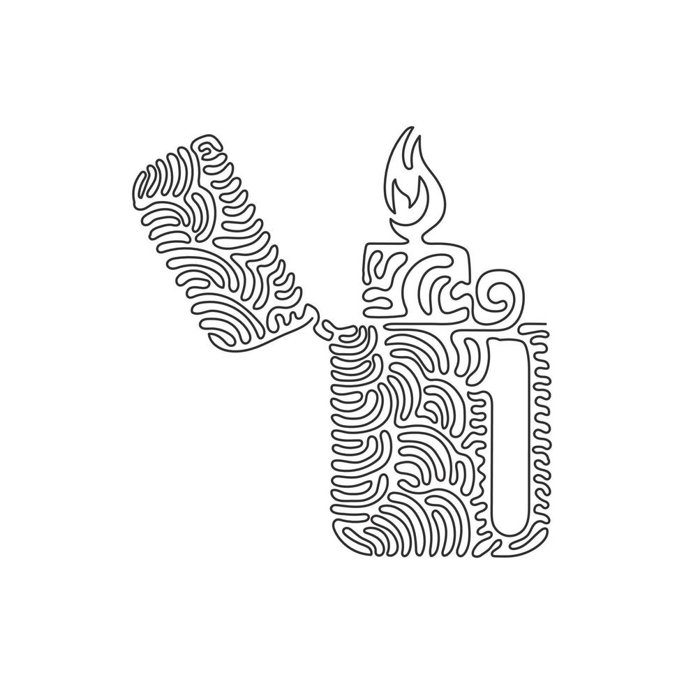 Single one line drawing metal lighter. Fire from lighter. Manual, gas lighter with burning flame in flat style. Swirl curl style concept. Modern continuous line draw design graphic vector illustration Pro Vector