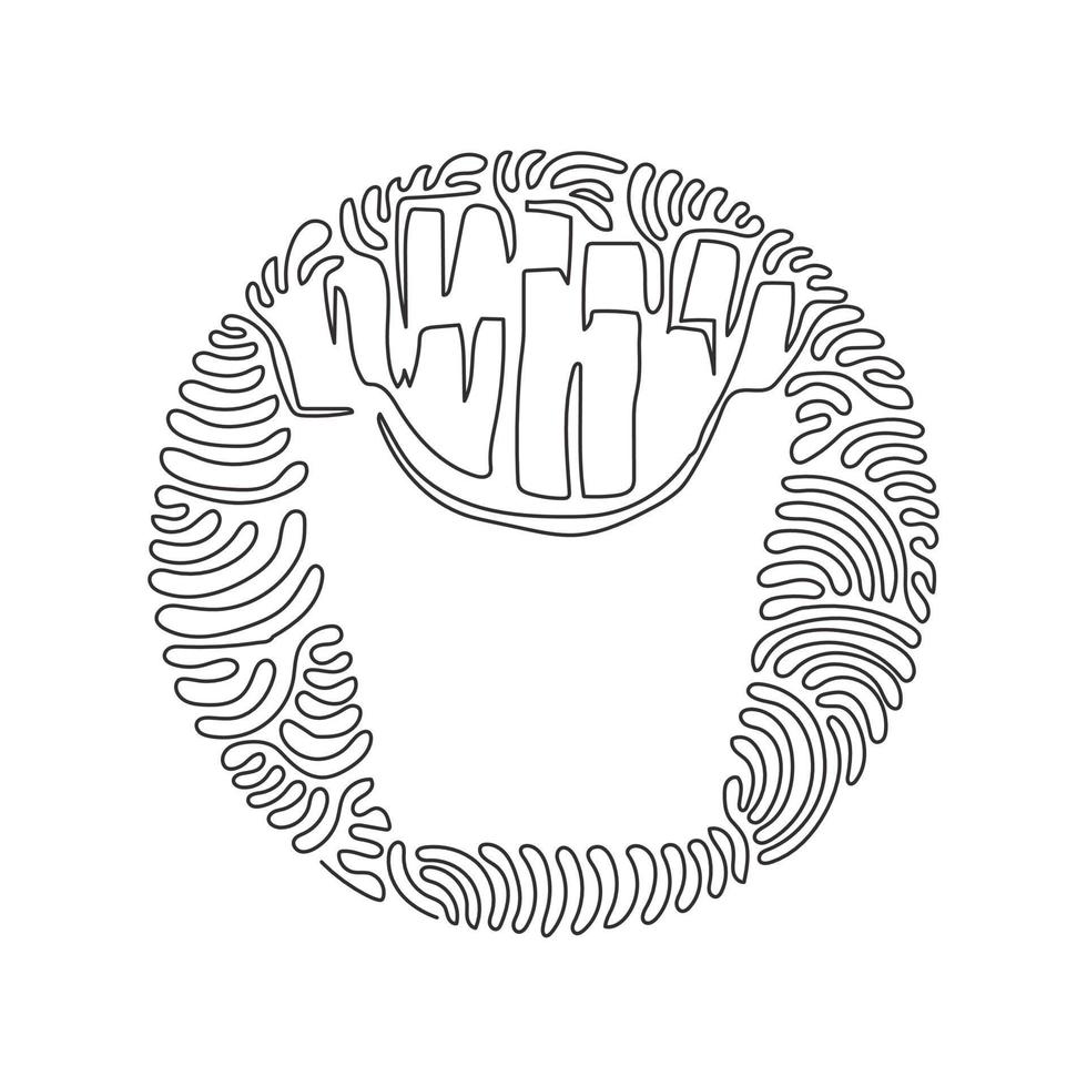 Continuous one line drawing French fries in paper box package, isolated. Fried potato. Fast food retro artwork. Swirl curl circle background style. Single line draw design vector graphic illustration Pro Vector