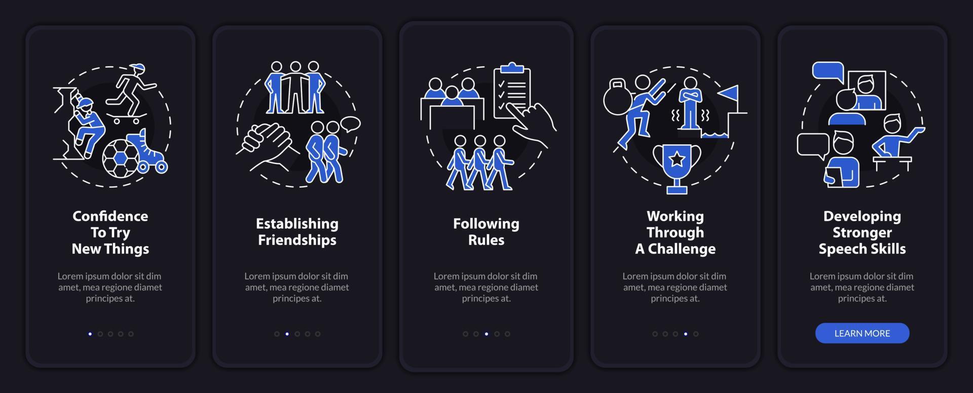 Healthy childhood development night mode onboarding mobile app screen. Walkthrough 5 steps graphic instructions pages with linear concepts. UI, UX, GUI template. Pro Vector