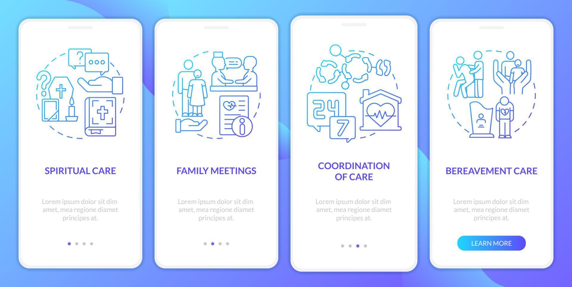 Hospice care blue gradient onboarding mobile app screen. Medical service walkthrough 4 steps graphic instructions pages with linear concepts. UI, UX, GUI template. Pro Vector