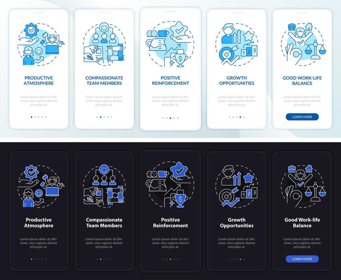 Office environment night and day mode onboarding mobile app screen. Walkthrough 5 steps graphic instructions pages with linear concepts. UI, UX, GUI template. Pro Vector