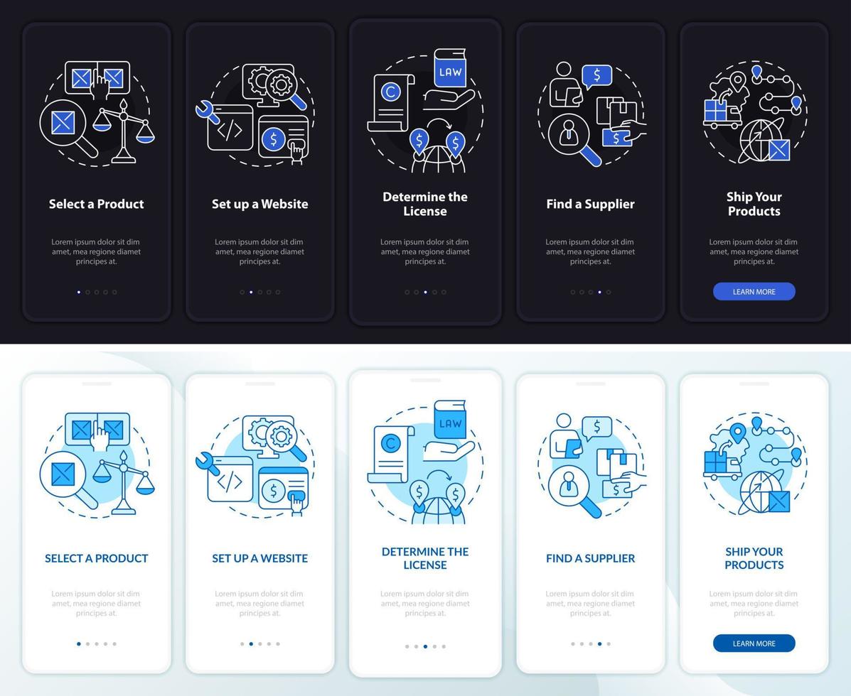 Start export business night and day mode onboarding mobile app screen. Walkthrough 5 steps graphic instructions pages with linear concepts. UI, UX, GUI template. Pro Vector