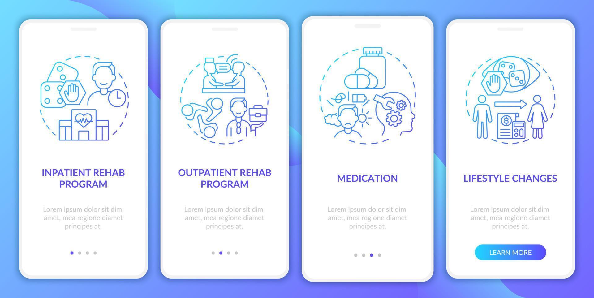 Gambling addiction treatment blue gradient onboarding mobile app screen. Walkthrough 4 steps graphic instructions pages with linear concepts. UI, UX, GUI template. Pro Vector