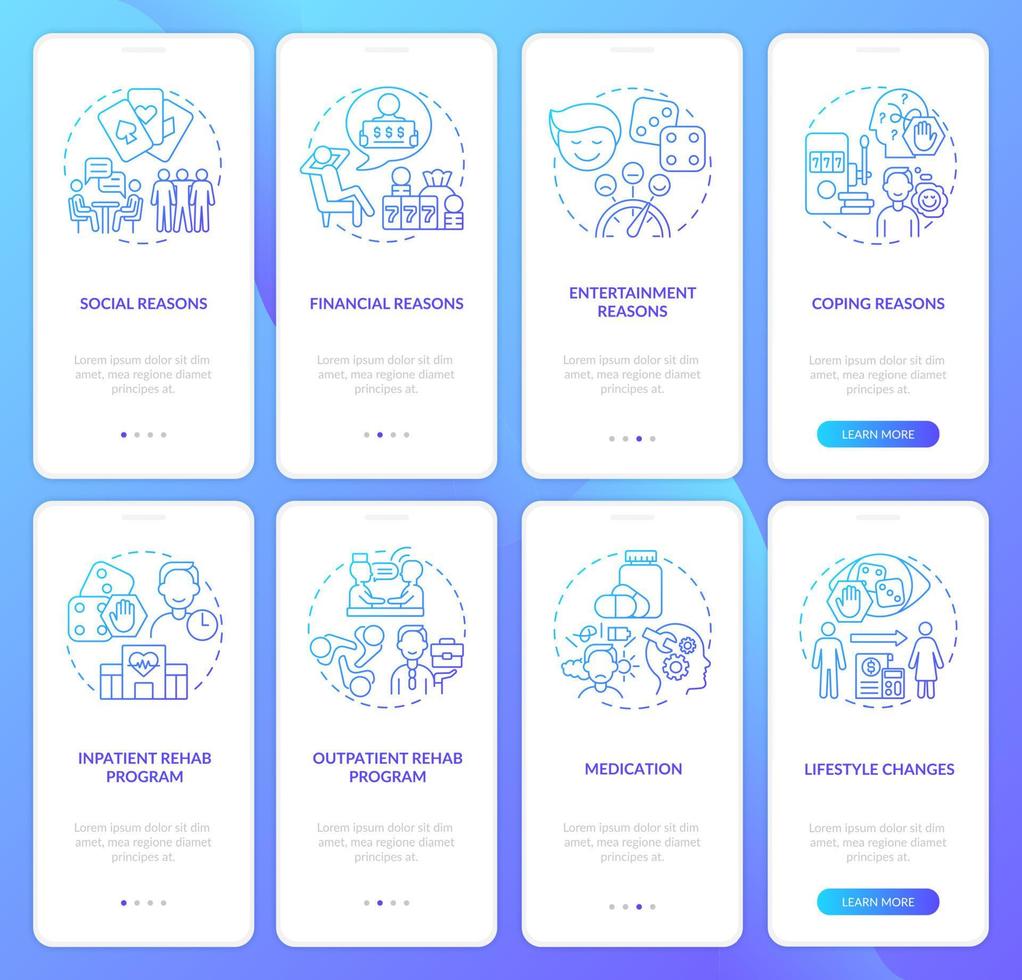 Gambling psychology blue gradient onboarding mobile app screen set. Walkthrough 5 steps graphic instructions pages with linear concepts. UI, UX, GUI template. Pro Vector