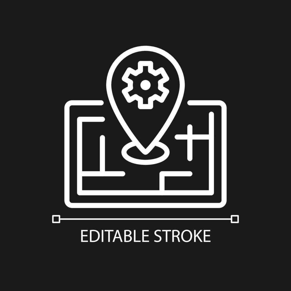 Smart mapping technology pixel perfect white linear icon for dark theme. Location on app. Internet of Things. Thin line illustration. Isolated symbol for night mode. Editable stroke. Pro Vector