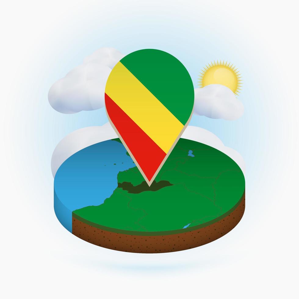 Isometric round map of Congo and point marker with flag of Congo. Cloud and sun on background. Pro Vector