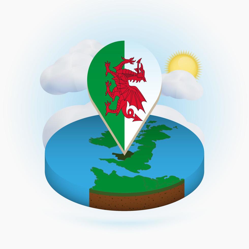 Isometric round map of Wales and point marker with flag of Wales. Cloud and sun on background. Pro Vector