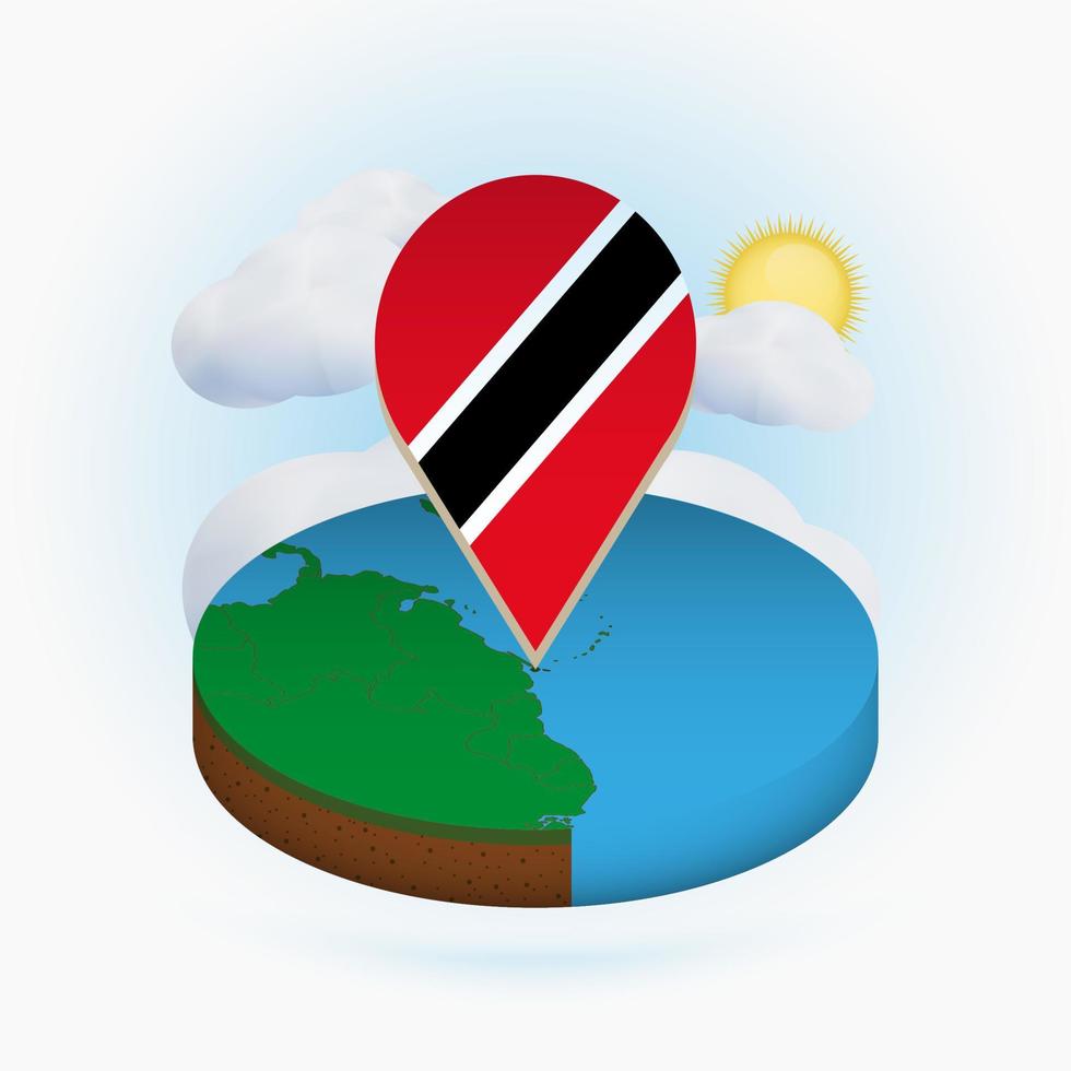 Isometric round map of Trinidad and Tobago and point marker with flag of Trinidad and Tobago. Cloud and sun on background. Pro Vector