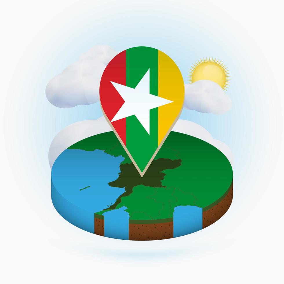 Isometric round map of Myanmar and point marker with flag of Myanmar. Cloud and sun on background. Pro Vector