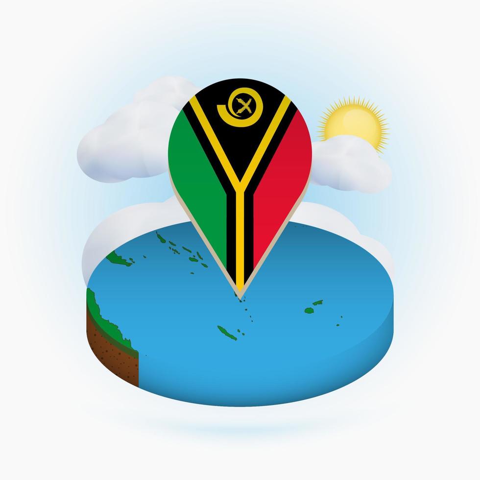 Isometric round map of Vanuatu and point marker with flag of Vanuatu. Cloud and sun on background. Pro Vector