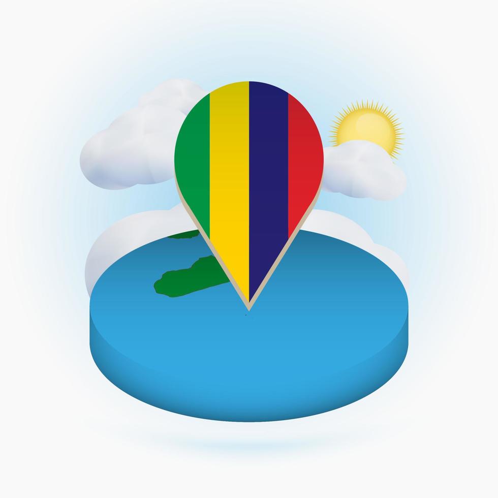 Isometric round map of Mauritius and point marker with flag of Mauritius. Cloud and sun on background. Pro Vector