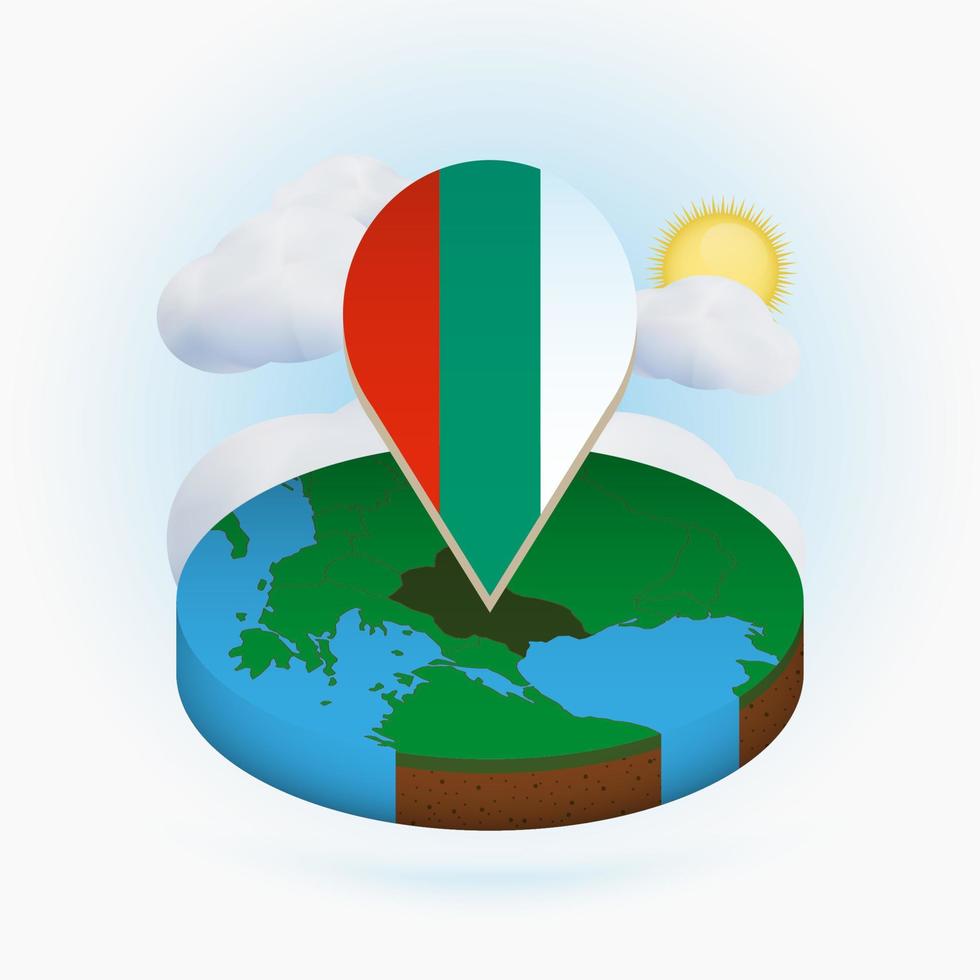 Isometric round map of Bulgaria and point marker with flag of Bulgaria. Cloud and sun on background. Pro Vector