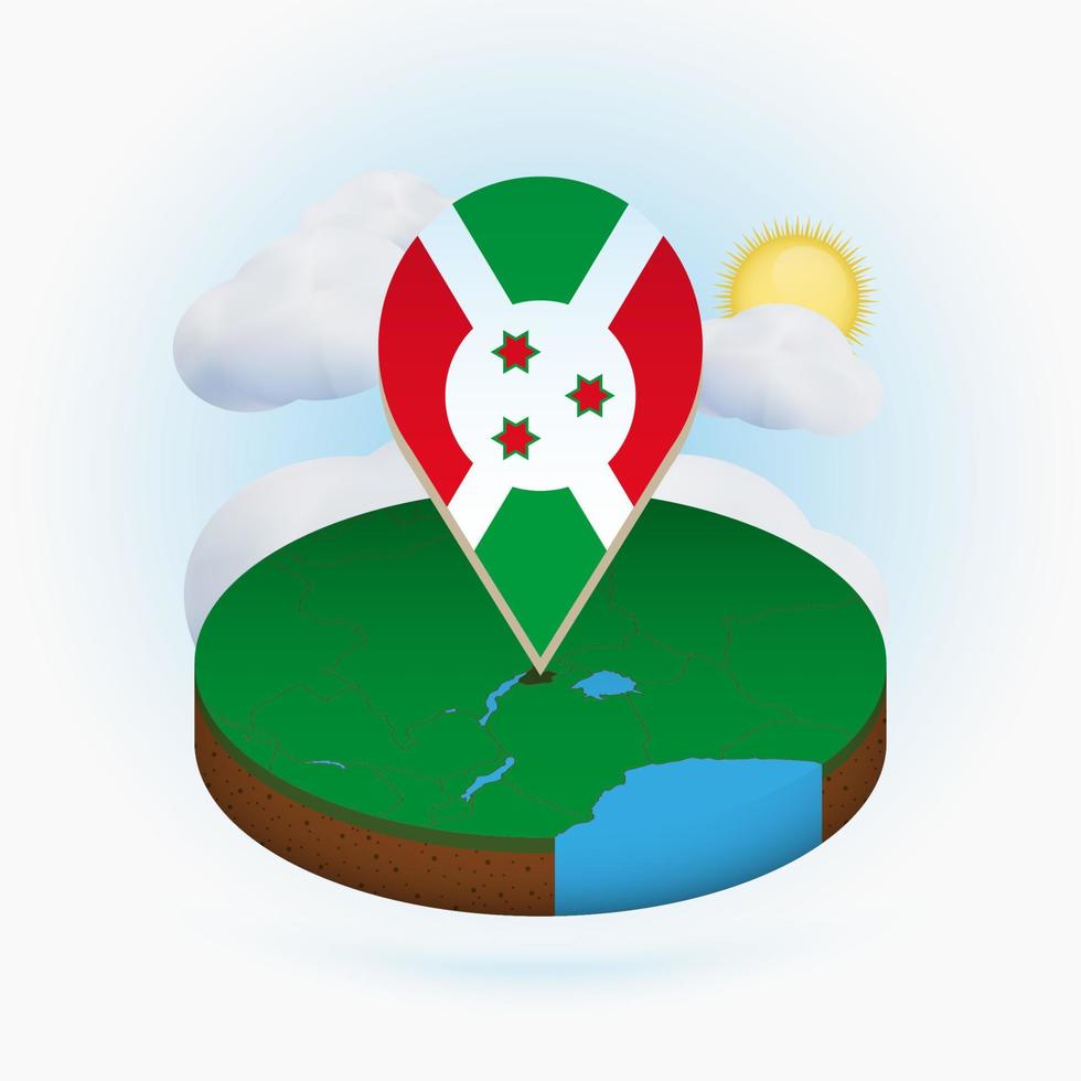 Isometric round map of Burundi and point marker with flag of Burundi. Cloud and sun on background. Pro Vector