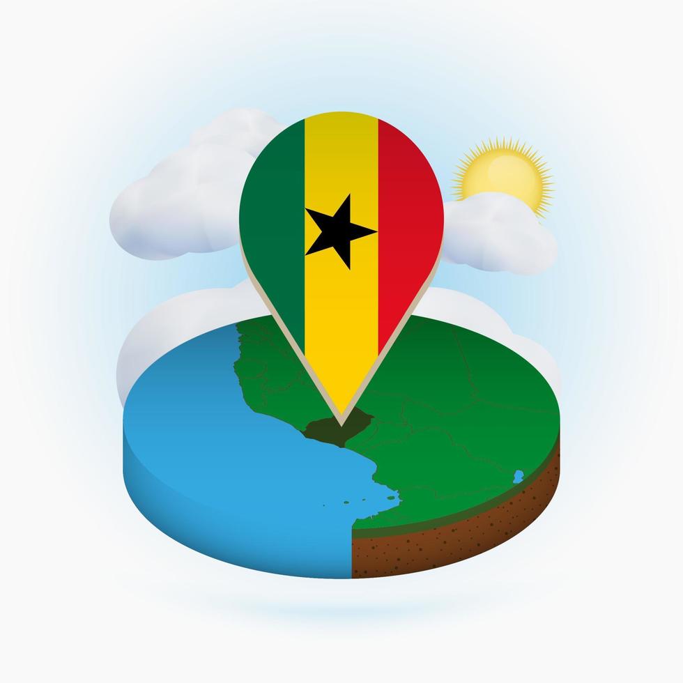 Isometric round map of Ghana and point marker with flag of Ghana. Cloud and sun on background. Pro Vector