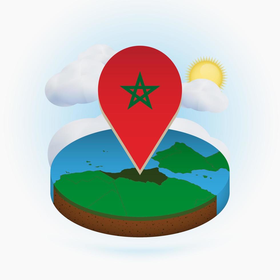 Isometric round map of Morocco and point marker with flag of Morocco. Cloud and sun on background. Pro Vector