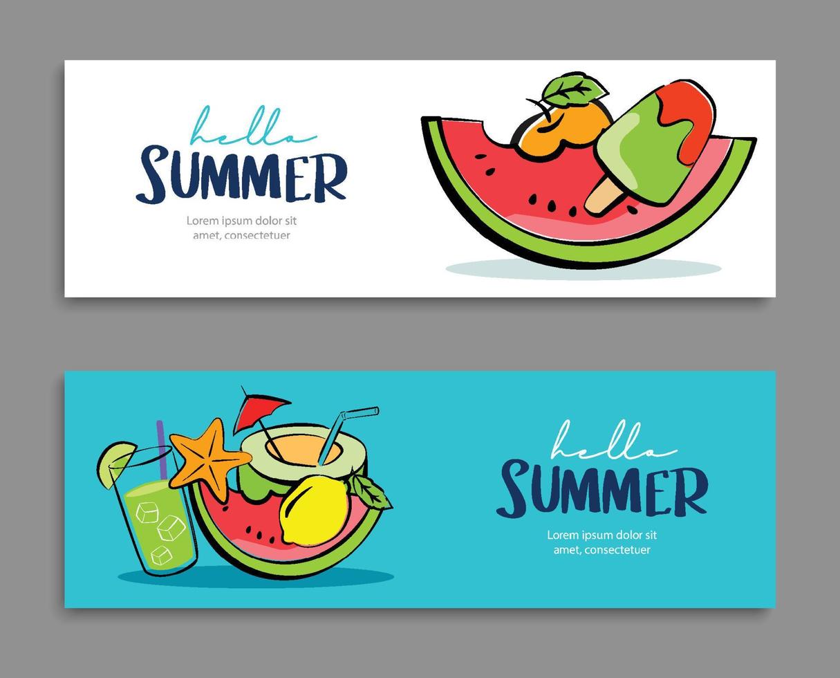 Hello summer banners design hand drawn style. Summer with doodles and objects elements for beach party background. Pro Vector