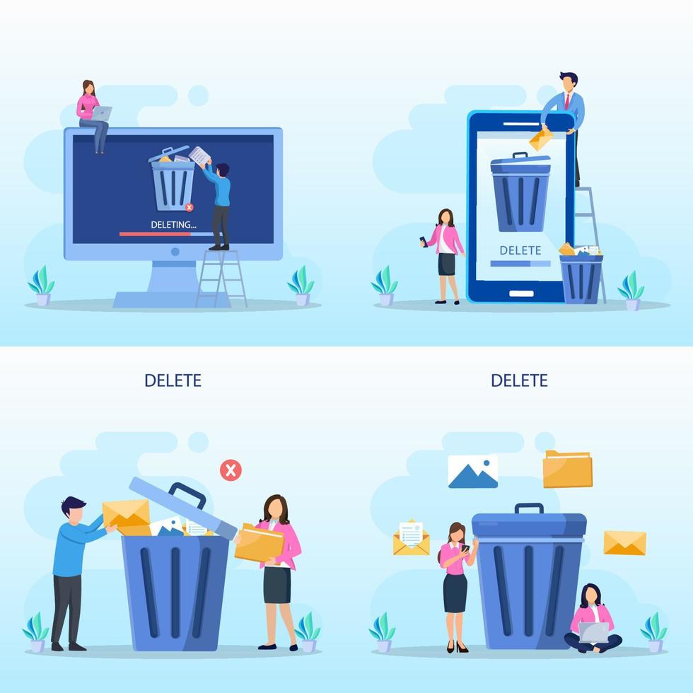 Delete concept. deleting data and move unnecessary files to the trash bin. illustration vector Pro Vector