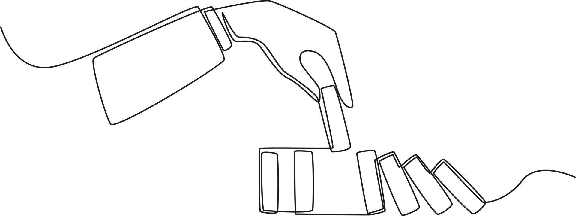 Continuous one line drawing The hand lays down one domino so that another domino does not fall. Stop domino effect of market . Single line draw design vector graphic illustration. Pro Vector