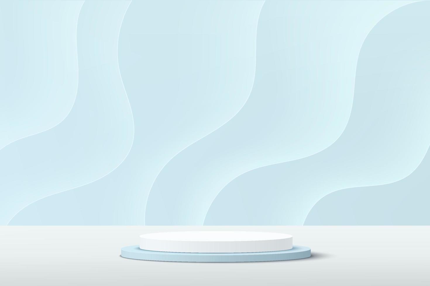 Abstract 3D white and blue cylinder pedestal podium with glowing light blue fluid wavy layers backdrop. Pastel blue minimal scene for product display presentation. Vector geometric rendering platform. Pro Vector