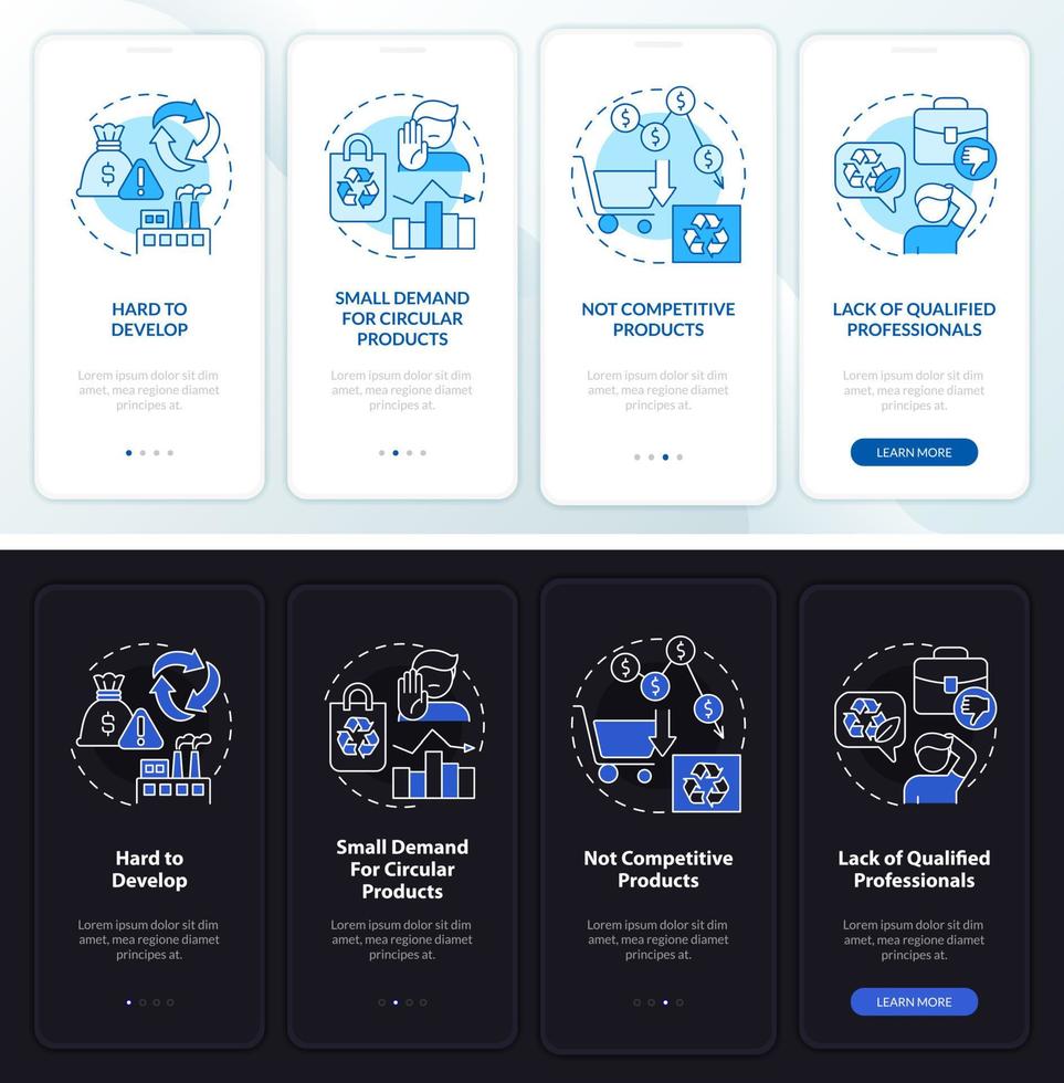 Circular economy hitches night and day mode onboarding mobile app screen. Walkthrough 4 steps graphic instructions pages with linear concepts. UI, UX, GUI template. Pro Vector