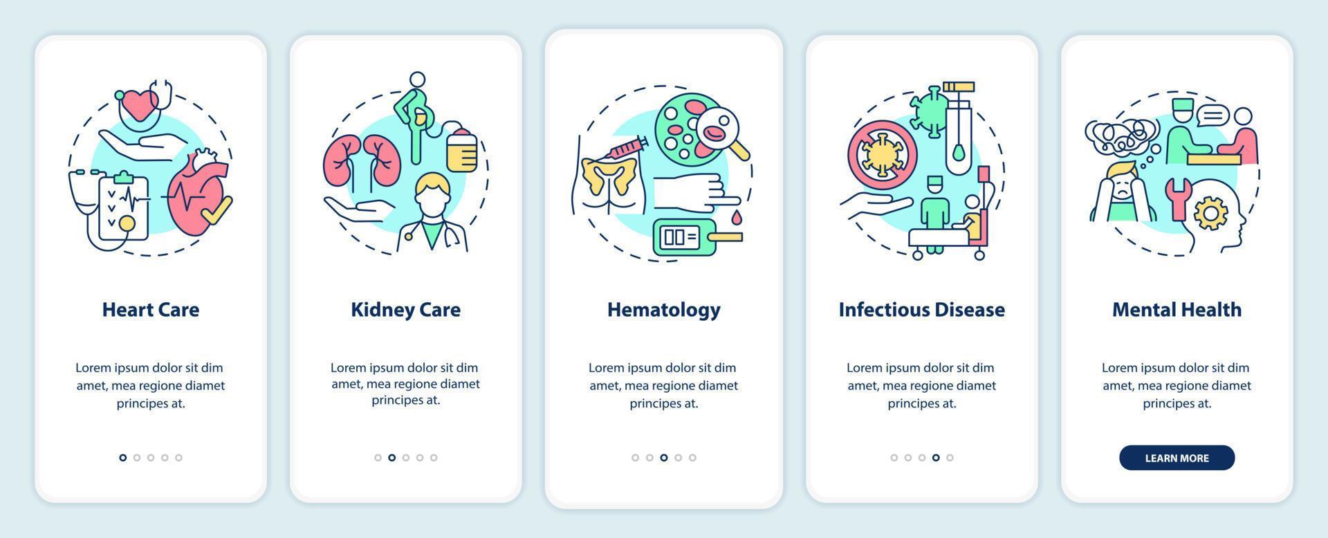 Providing medical services onboarding mobile app screen. Medicine walkthrough 5 steps graphic instructions pages with linear concepts. UI, UX, GUI template. Pro Vector