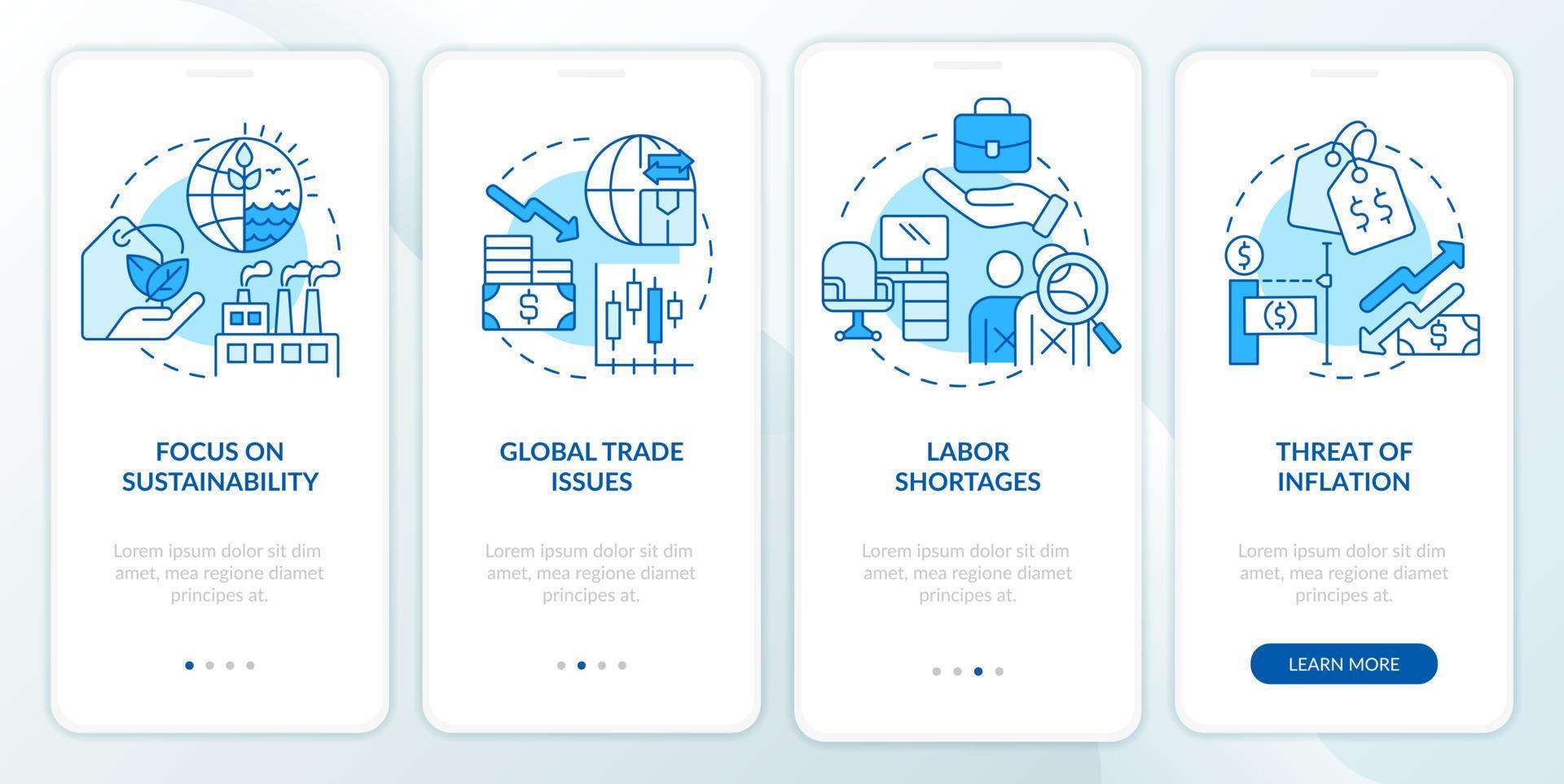 Macro economy trends blue onboarding mobile app screen. Commerce walkthrough 4 steps graphic instructions pages with linear concepts. UI, UX, GUI template. Pro Vector