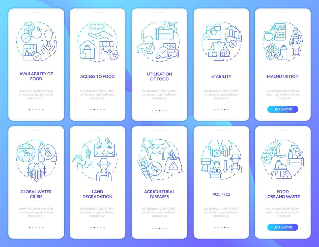 Food security blue gradient onboarding mobile app screen set. Problems walkthrough 5 steps graphic instructions pages with linear concepts. UI, UX, GUI template. Pro Vector