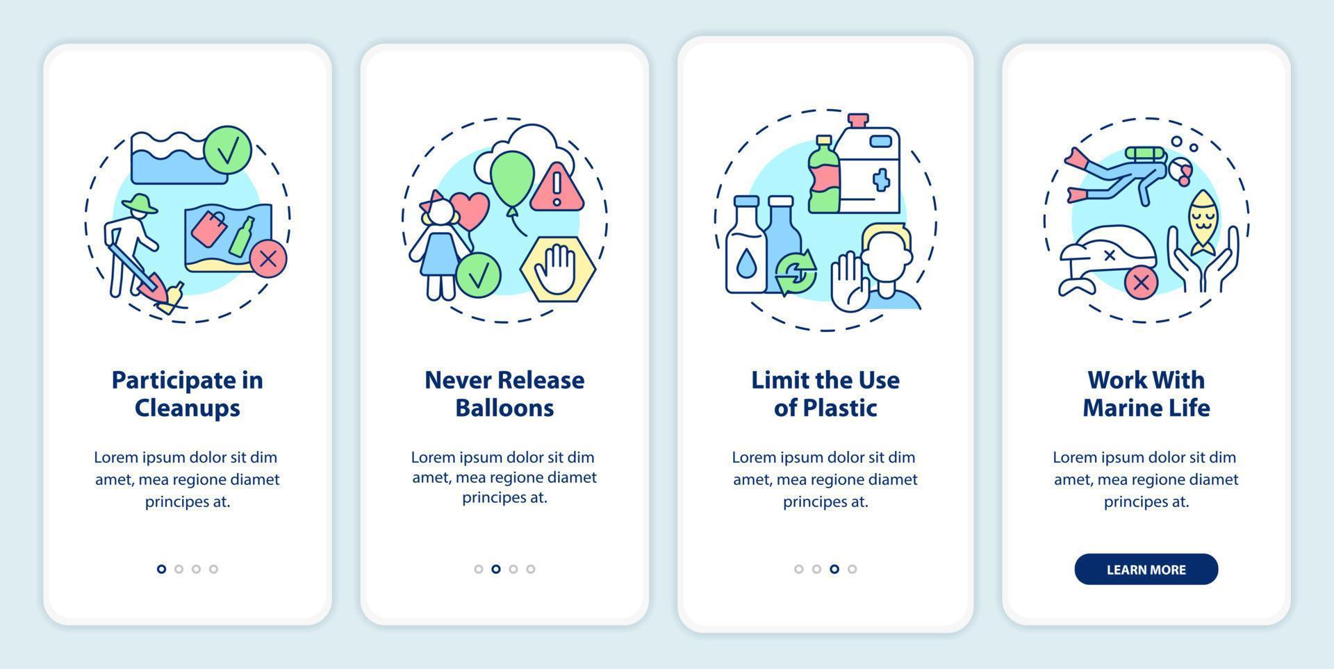 Protecting marine life onboarding mobile app screen. Beach cleanups walkthrough 4 steps graphic instructions pages with linear concepts. UI, UX, GUI template. Pro Vector