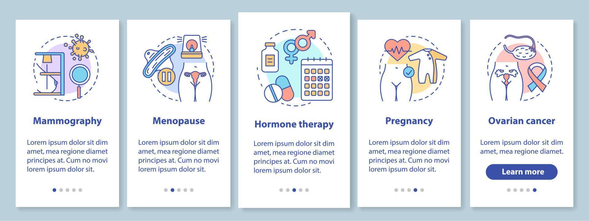 Women healthcare onboarding mobile app page screen with linear concepts. Pregnancy, ovarian cancer, menopause. Walkthrough steps graphic instructions. UX, UI, GUI vector template with illustrations Pro Vector