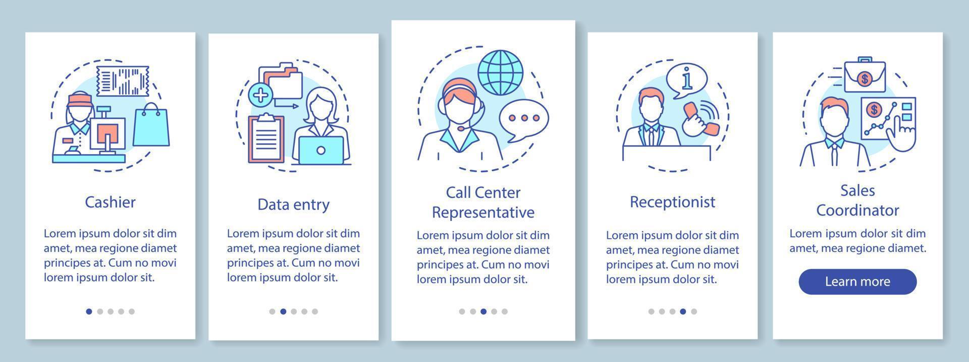 Finding part time jobs onboarding mobile app page screen with linear concepts. Receptionist, sales coordinator walkthrough steps graphic instructions. UX, UI, GUI vector template with illustrations Pro Vector