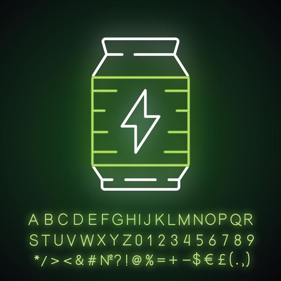 Energy drink can neon light icon. Video game extra life, energy. Recovery levels. Computer game inventory, player item. Glowing sign with alphabet, numbers and symbols. Vector isolated illustration Pro Vector