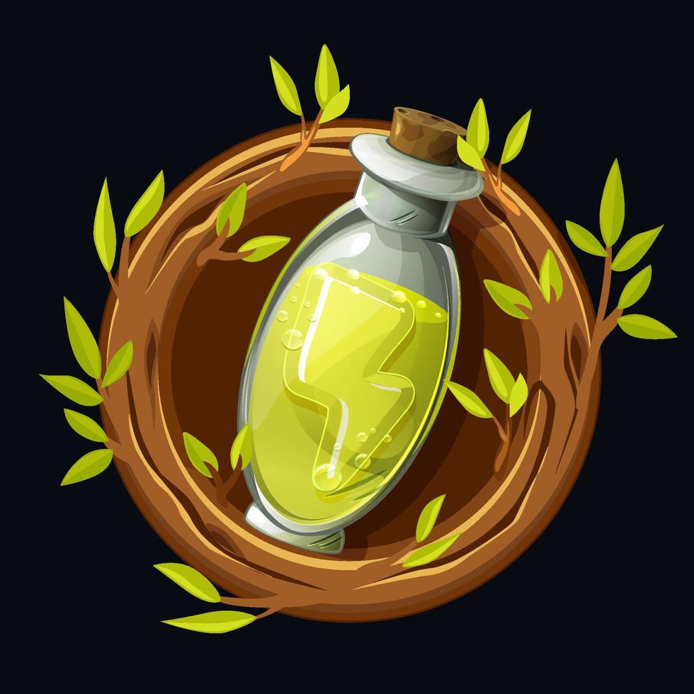 Magic potion with energy in a wreath of twigs. Vector illustration of a jar icon with an elixer in a wooden frame. Pro Vector