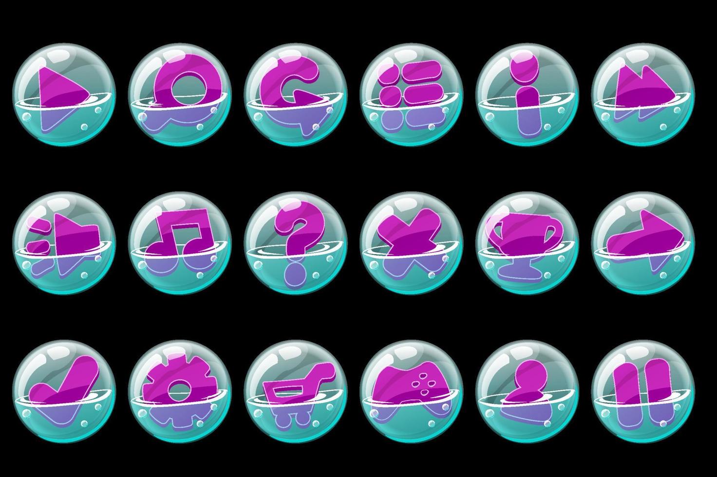 A collection of purple buttons in soap bubbles. Set of bubble icons for graphical interface. Pro Vector
