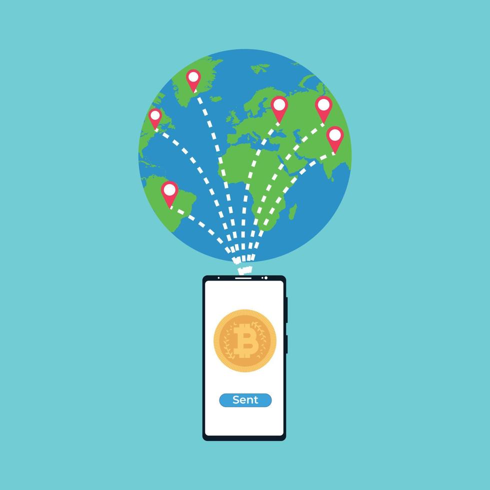 Sending bitcoin to anywhere in the world with a smartphone vector. Bitcoin and money transaction method with a world map and location points. Online money transaction system with a mobile phone. Pro Vector