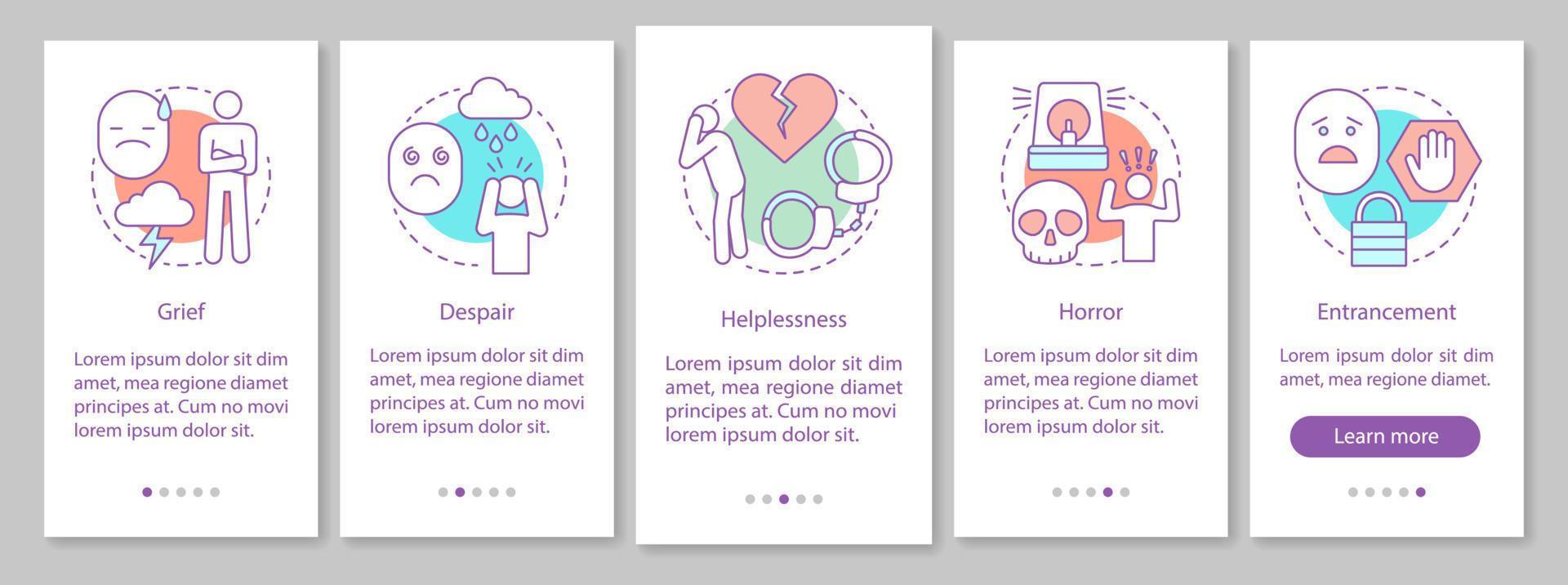 Depression onboarding mobile app page screen vector template. Sadness. Hopeless circumstances. Panic, bipolar disorder. Mental health. Walkthrough website steps. UX, UI, GUI smartphone interface Pro Vector