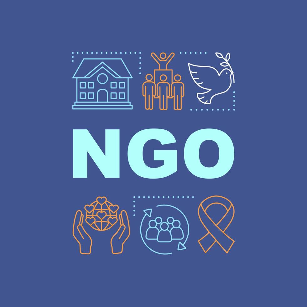 NGO word concepts banner. Non governmental, nonprofit organization. Charitable foundation. Presentation, website. Isolated lettering typography idea with linear icons. Vector outline illustration Pro Vector