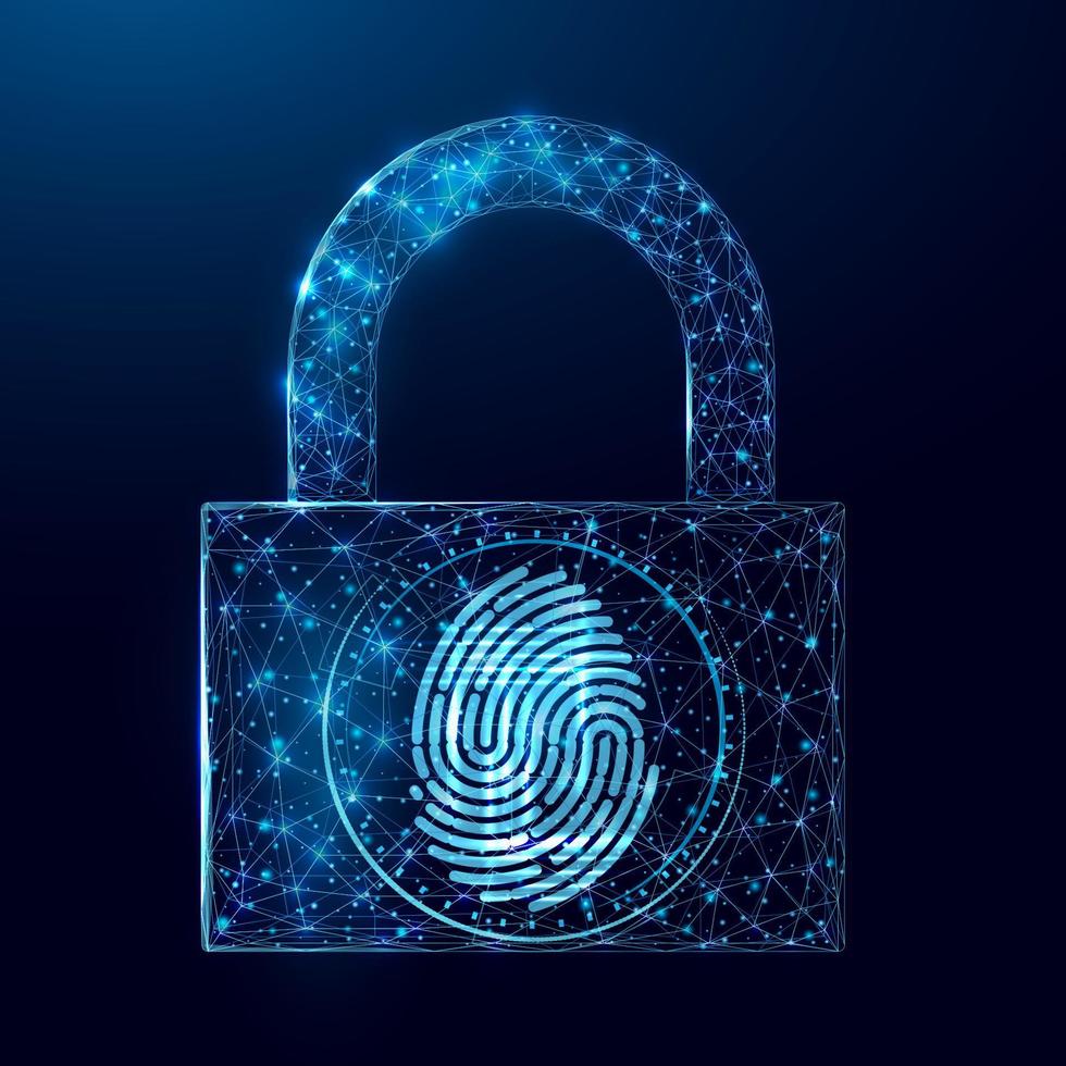 Fingerprint in padlock. Cyber security, technology identification concept with glowing low poly lock. Wireframe polygonal design. Vector illustration. Pro Vector