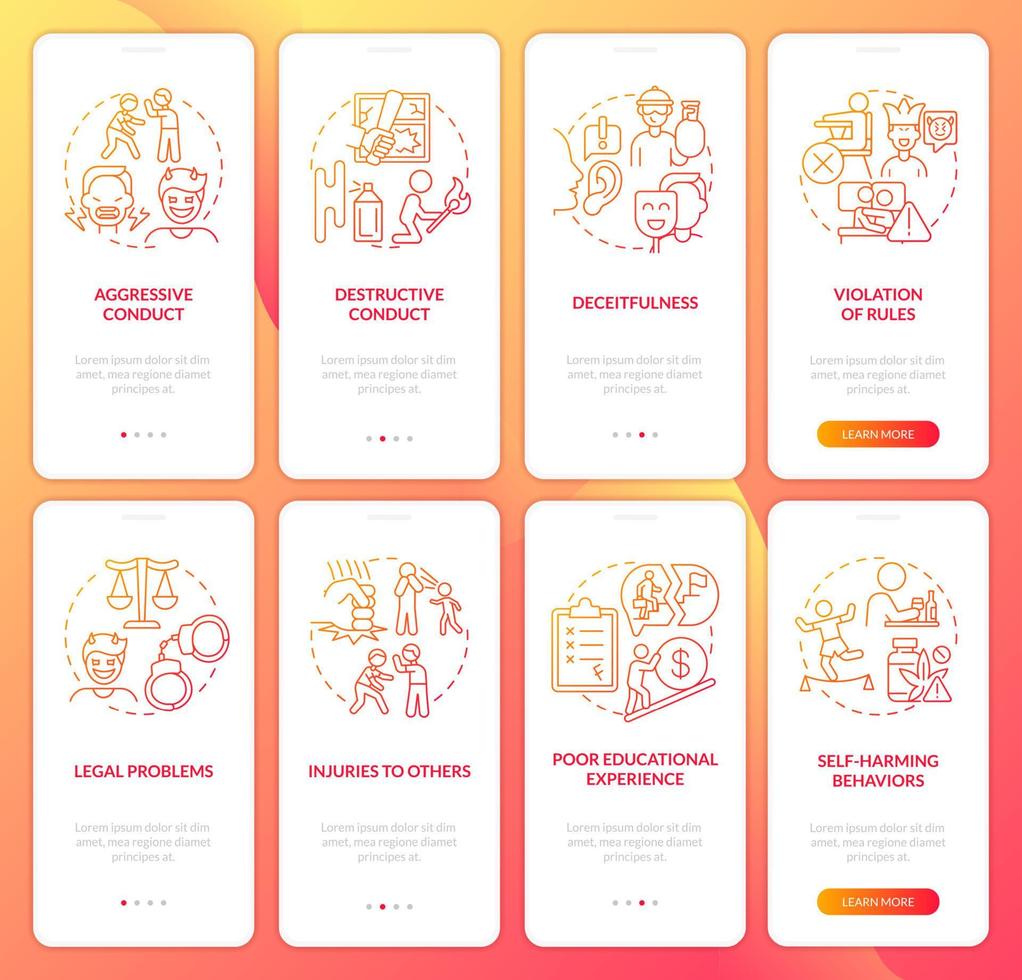 Conduct disorder red gradient onboarding mobile app screen set. Walkthrough 4 steps graphic instructions pages with linear concepts. UI, UX, GUI template. Pro Vector