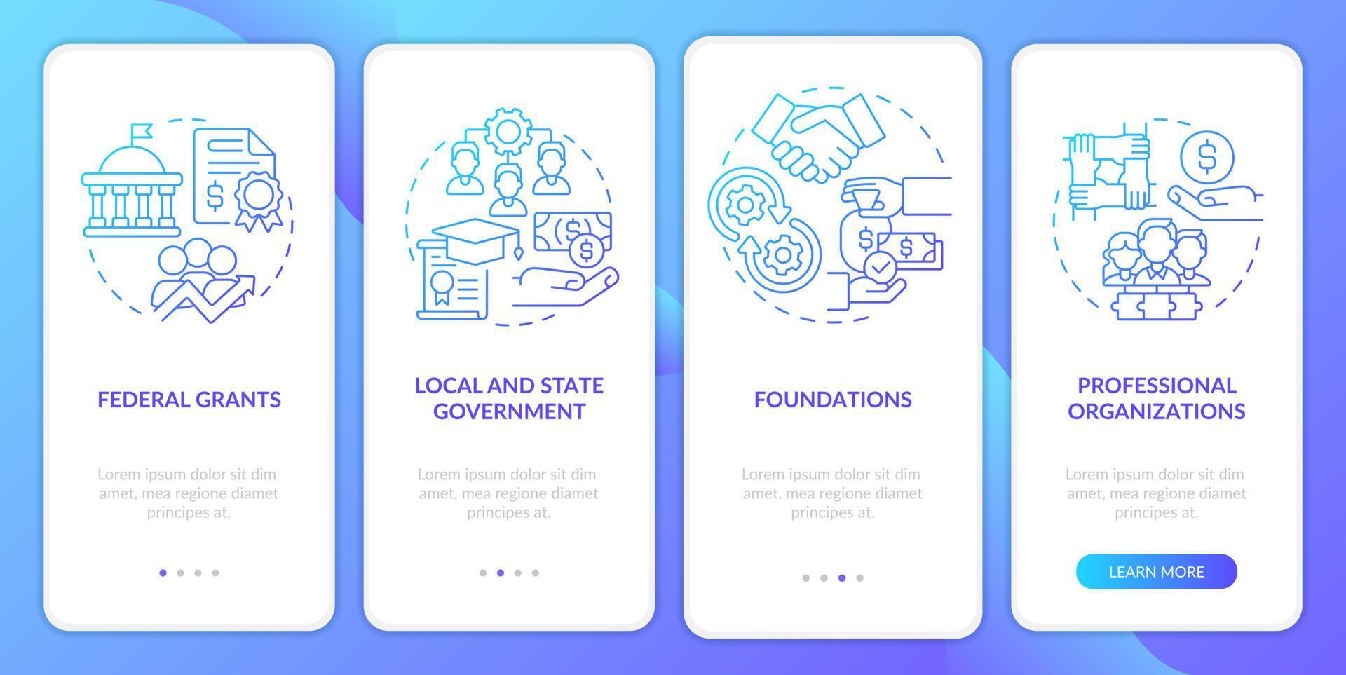 Workplace development grants blue gradient onboarding mobile app screen. Walkthrough 4 steps graphic instructions pages with linear concepts. UI, UX, GUI template. Pro Vector
