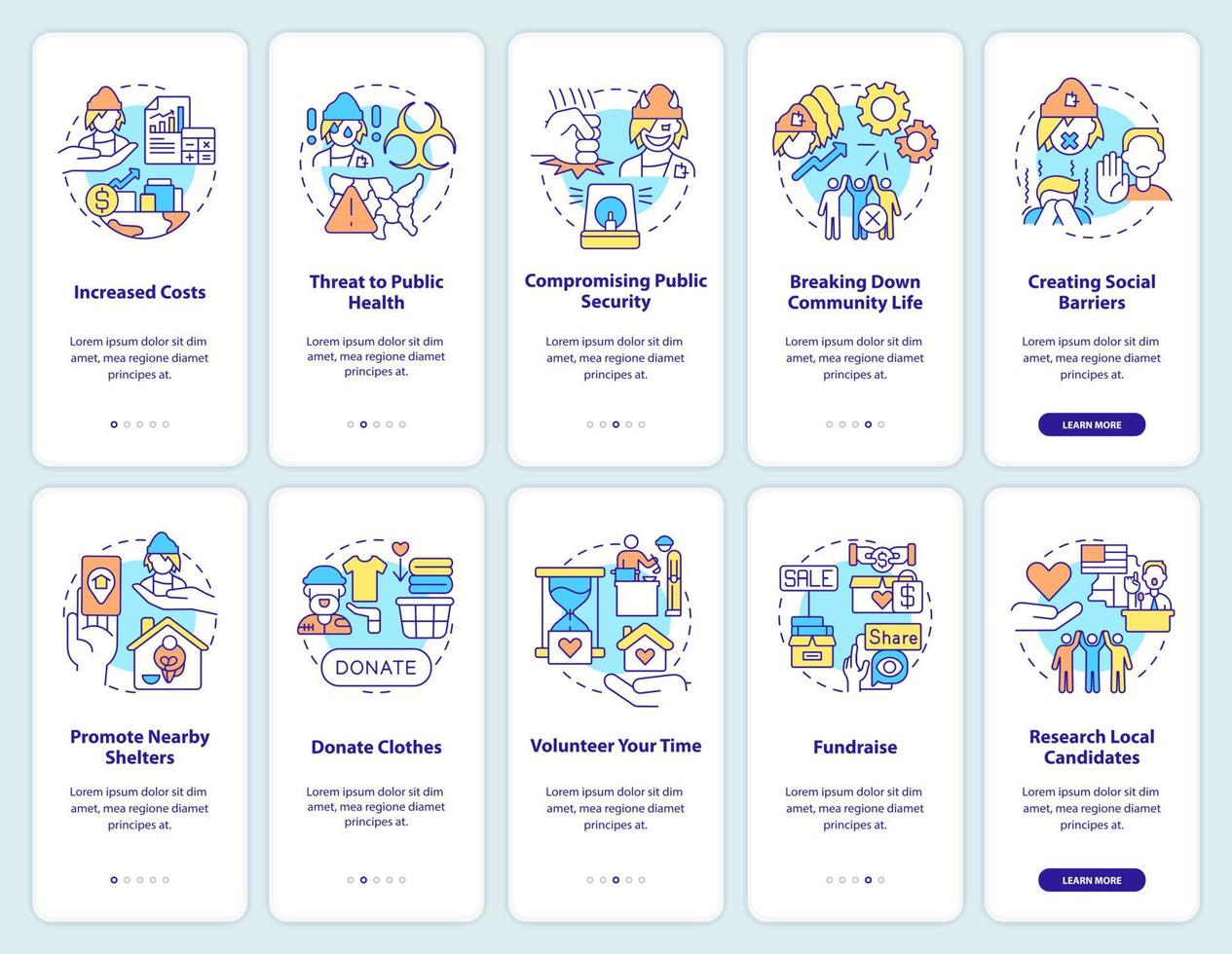 Homelessness problems and solutions onboarding mobile app screen set. Walkthrough 5 steps graphic instructions pages with linear concepts. UI, UX, GUI template. Pro Vector