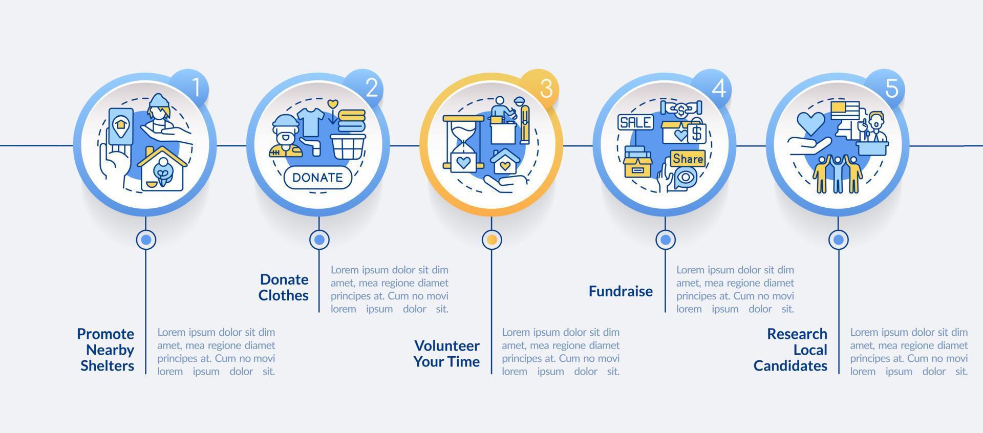 Homelessness assistance circle infographic template. Fundraise. Data visualization with 5 steps. Process timeline info chart. Workflow layout with line icons. Pro Vector
