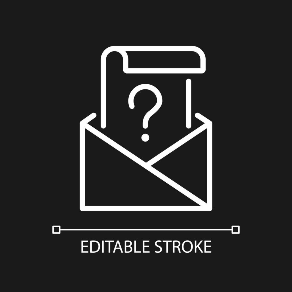 Mail question white linear icon for dark theme. Envelope and letter with question mark. Issue solution. Thin line illustration. Isolated symbol for night mode. Editable stroke. Pro Vector