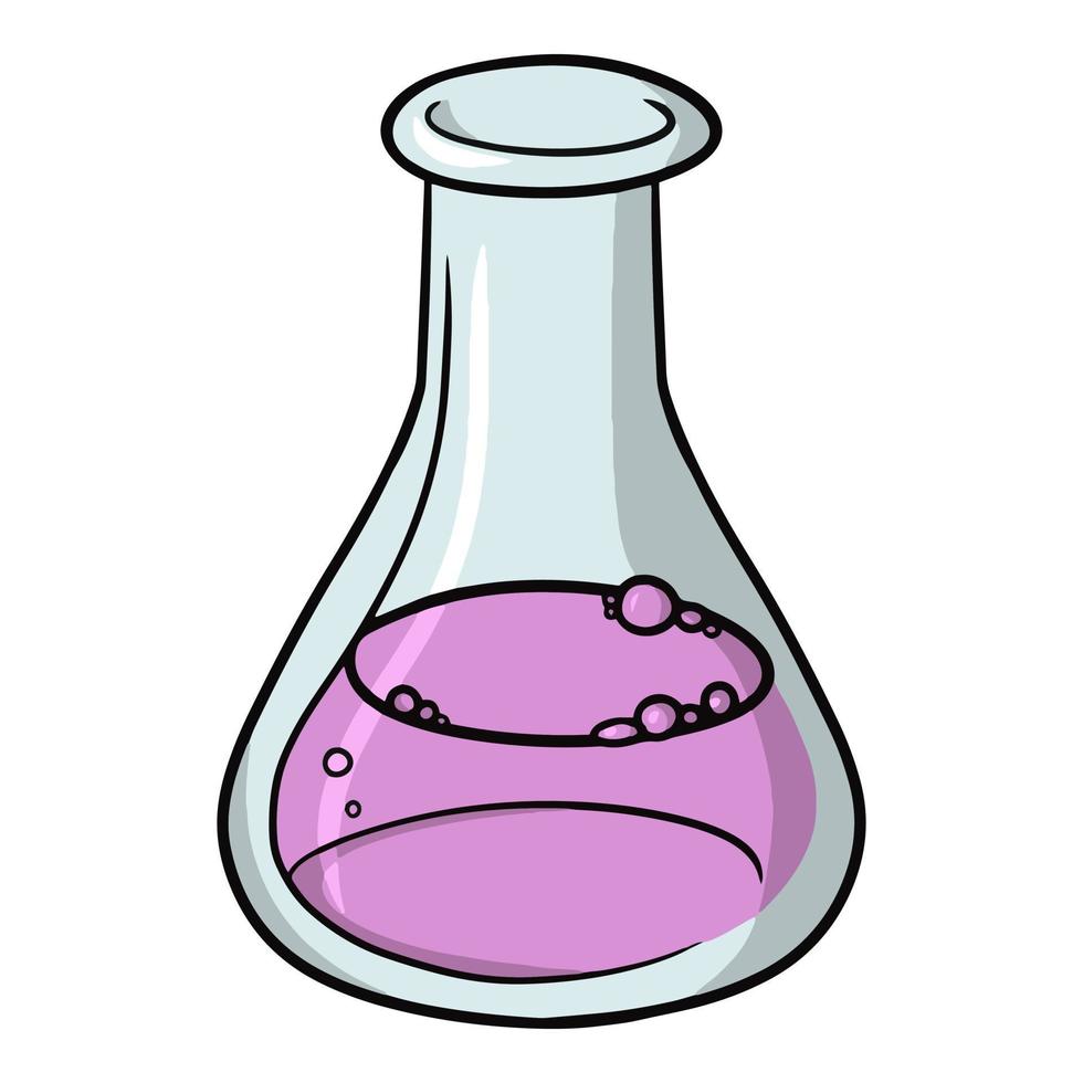 Triangular glass flask with pink solution for experiments, vector cartoon illustration on a white background Pro Vector