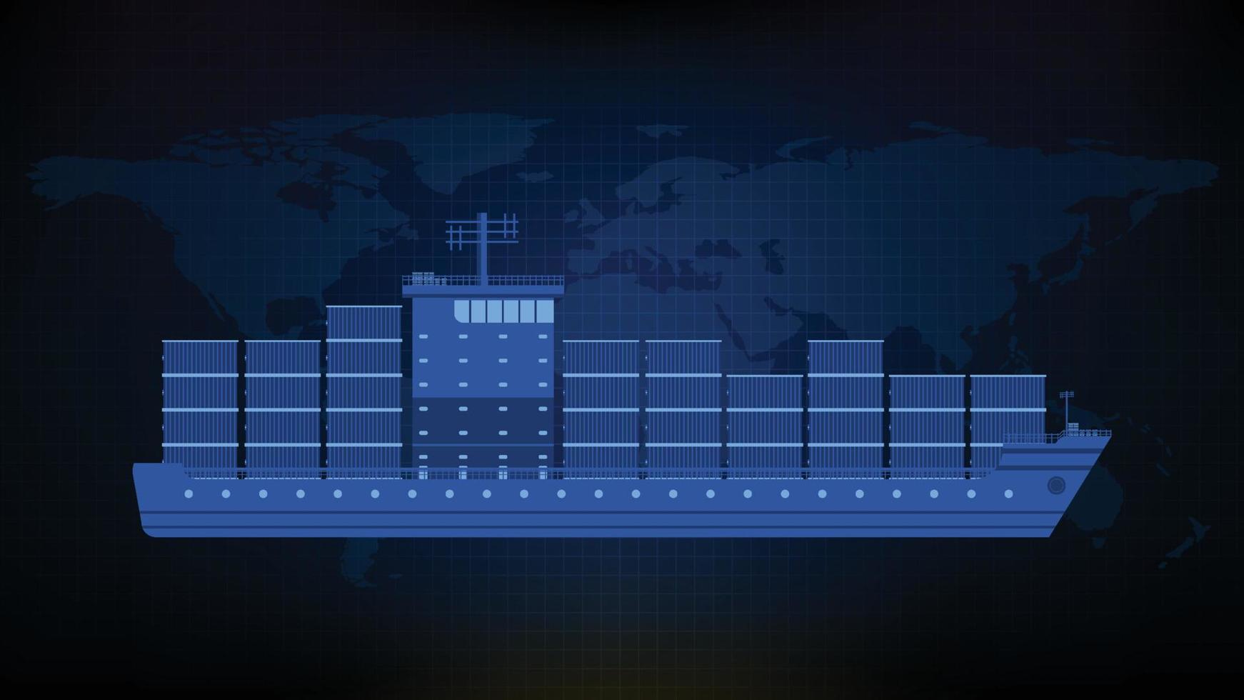abstract blue background of side view shipping container cargo ship with world map Pro Vector