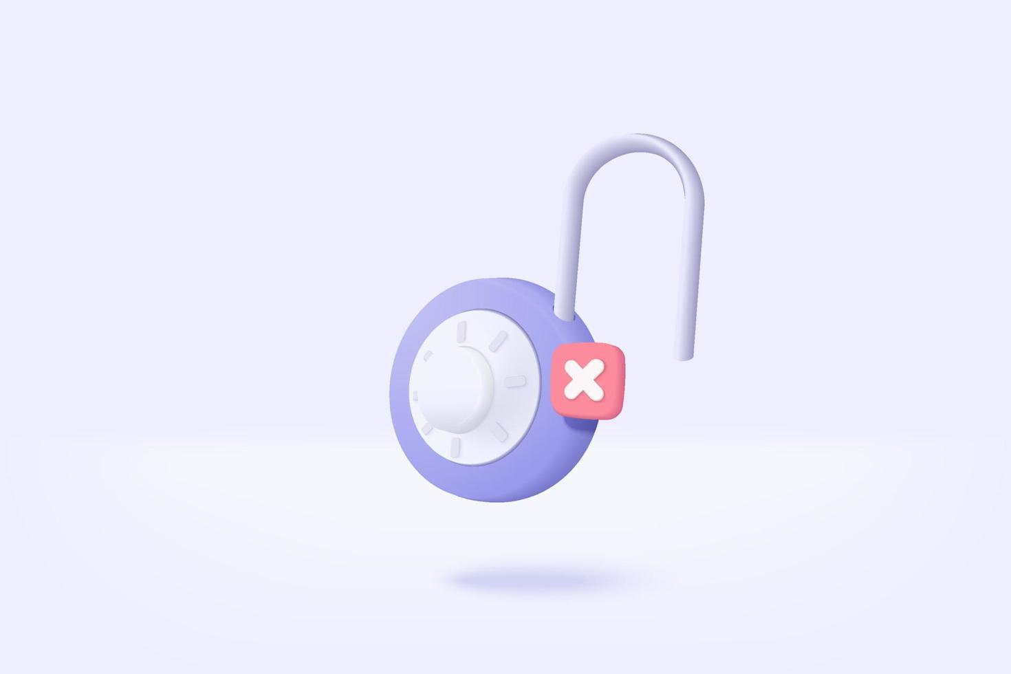 3D padlock for password unsecure online on white background. Closed padlock sign. Cyber security digital data protection minimal concept. 3d security protection on isolated vector render illustration Pro Vector
