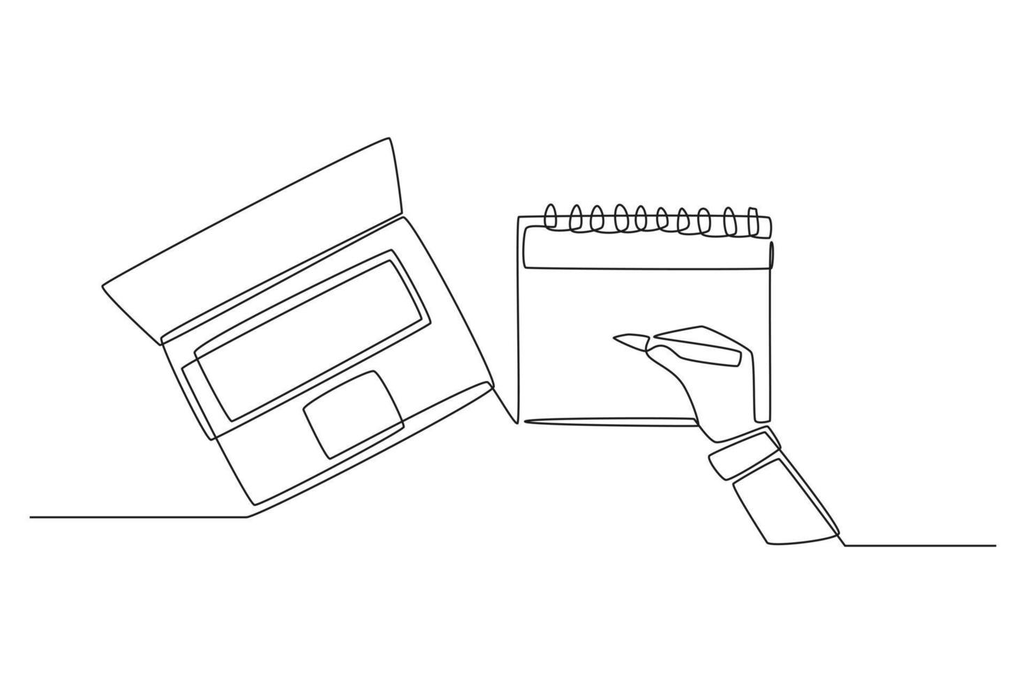 Single one line drawing Hand with pen mark calendar and checking with laptop. Planning and scheduling concept. Continuous line draw design graphic vector illustration. Pro Vector